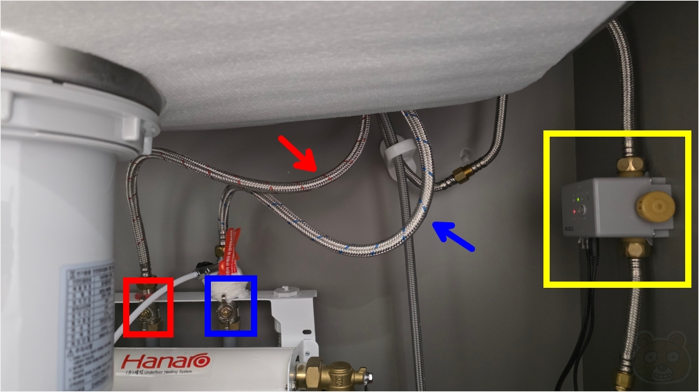싱크대 하부를 열어보면 뭔가 수전과 연결된 파이프들이 보일겁니다. 빨간색이 온수, 파란색이 냉수입니다. 그리고 노란색 박스 표시가 되어있는 부분이 절수패달 센서와 연결된 부분입니다. 일단 물을 잠궈야 하는데 온수와 냉수가 연결된 파이프를 보시면 레버가 있습니다. 빨간색, 파란색 박스로 표시된 부분이죠. 오른쪽으로 돌리면 잠깁니다.