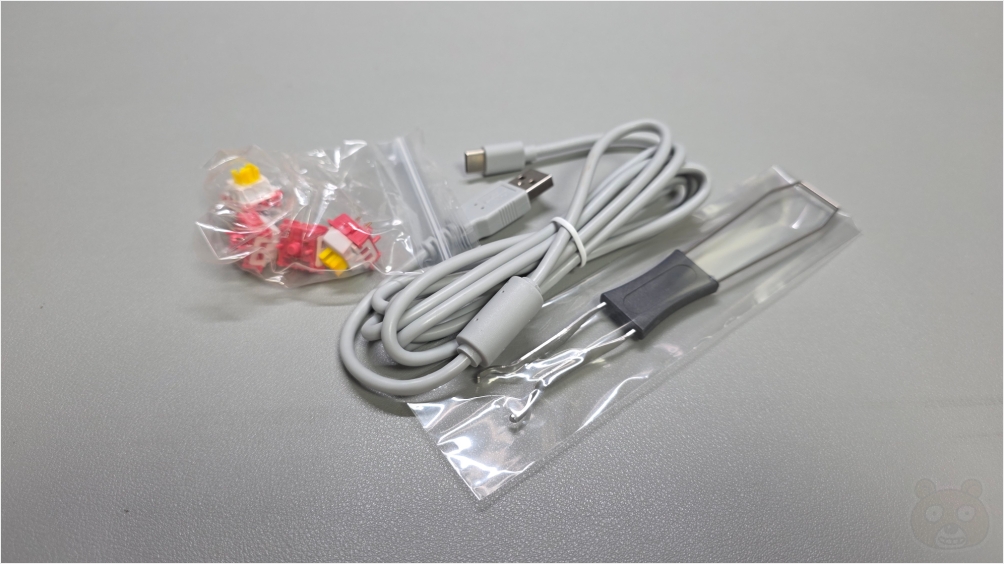 나머지 구성품은 여분의 황축, 유선 및 충전 전용 C to A타입 케이블, 키캡 리무버입니다. 축은 레오보그 님버스 V3 황축이고요.