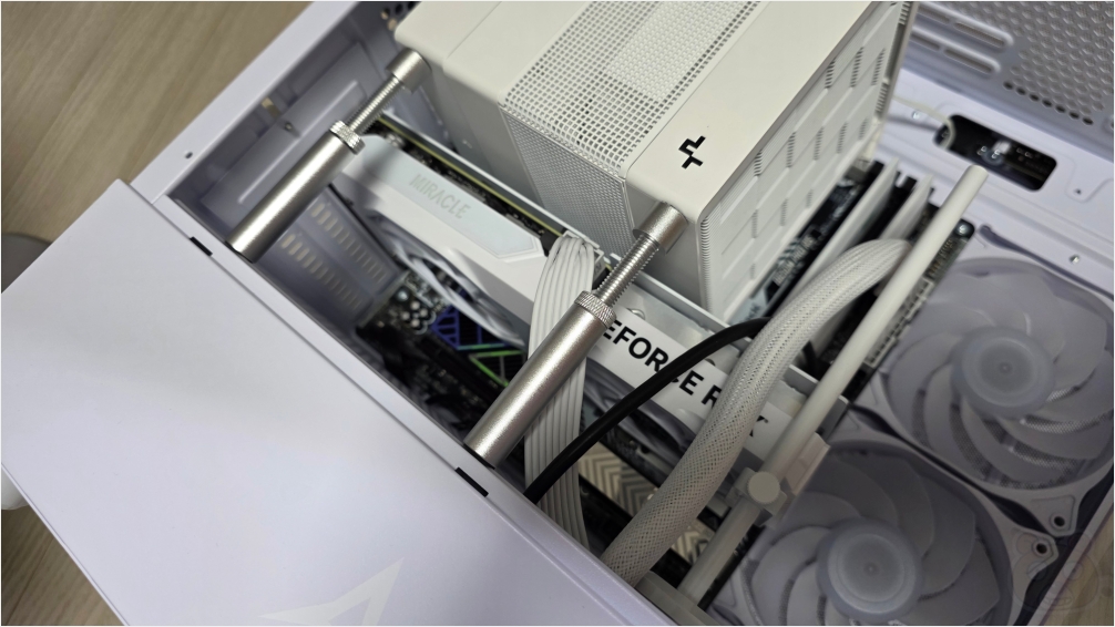 딱 하나 아쉬운건 제 RTX 4060이 화이트 색상이란 말이죠? 이건 다크 그레이입니다. 그래서 화이트 깔맞춤 밸런스가 무너지게 되는데... 뭐 상관 없습니다. 어차피 본체는 구석에 있으니까 말입니다.