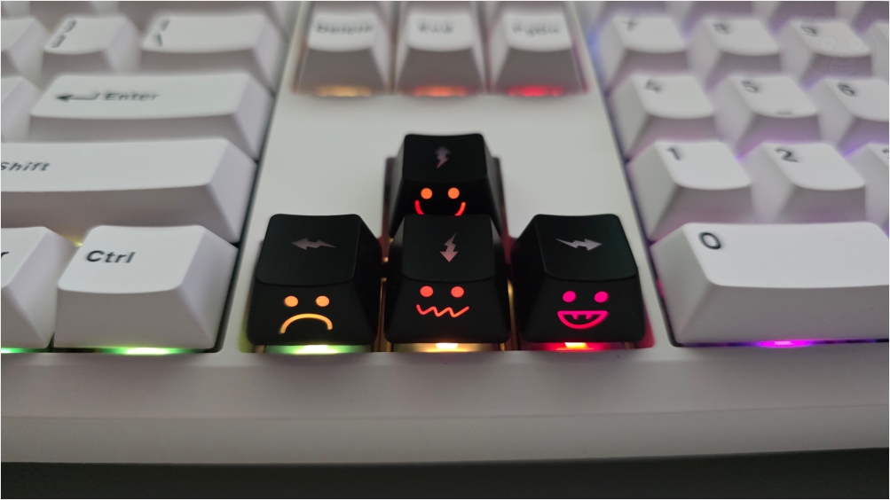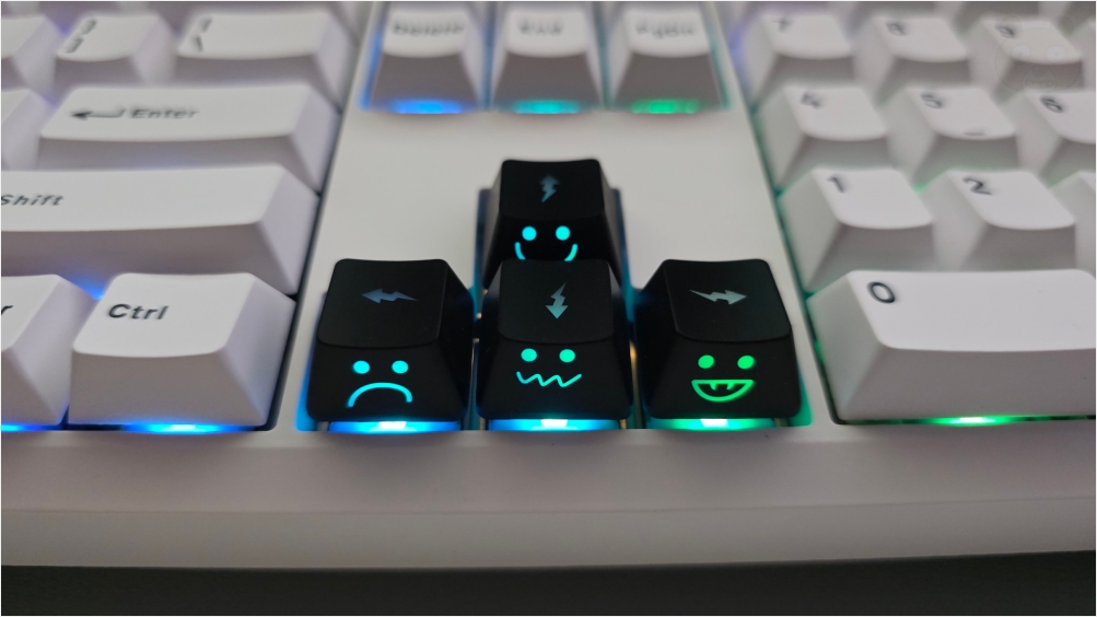 방을 어둡게 하고 야간에 키보드를 이용한다는 생각으로 영롱하게 만든 상태입니다. 이건 좀 귀엽네요! 확실히 LED빨을 잘 받는 키캡인 것 같습니다. 간단하게 키보드를 꾸미는 방법 중 하나가 바로 키캡을 바꾸는건데 이번 키캡은 꽤 귀여운 편입니다. 부분만 독특한 키캡을 찾으시면 한번 이 키캡도 장바구니에 담아보시면 어떨까 싶군요. 끝.